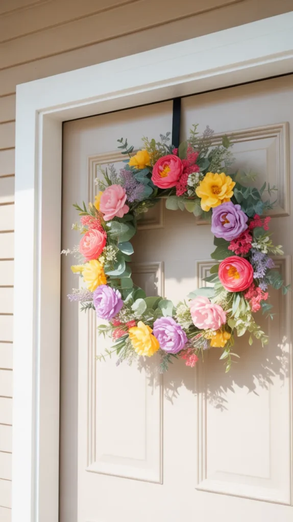 You can change flower colors by season for a fresh look. These hangings make doors look neat, cheerful, and welcoming without feeling heavy.