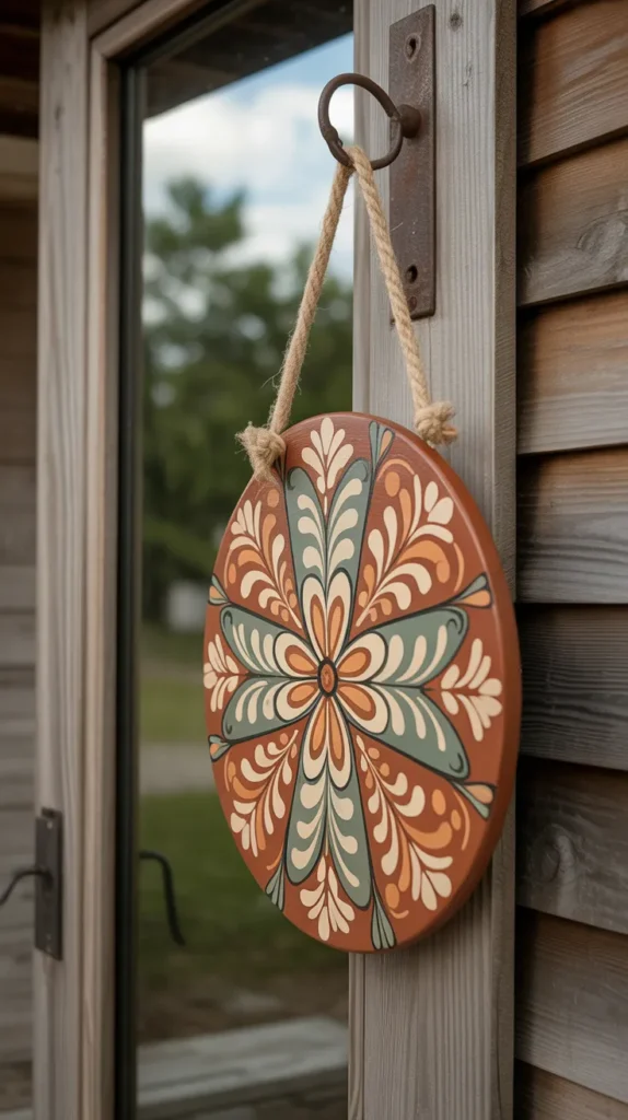 Wooden door hangings with hand-painted designs add warmth and character. Bright painted patterns, floral art, or simple symbols make the door look artistic and welcoming.