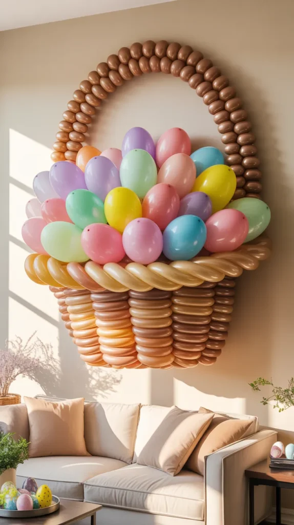 Create a balloon wall shaped like a basket with colorful balloon “eggs” inside. Use brown balloons for the basket base and bright pastels for eggs.