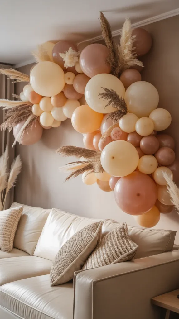 Use beige, cream, blush, and sage balloons for a calm boho look. Add pampas grass or wooden accents.