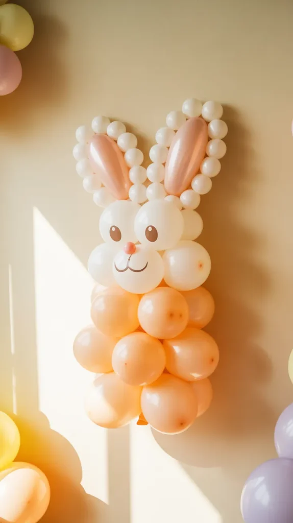 A bunny-shaped balloon wall display adds playful character to your Easter decor. Use white balloons for the face, pink for ears, and small black balloons for eyes. Place it on a feature wall or kids’ play area for instant smiles. This arrangement works great in apartments where space is limited.