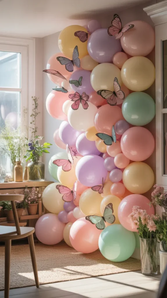 Add paper or balloon butterflies over a pastel balloon base. This turns your wall into a spring garden scene. It’s light, airy, and great for small spaces.