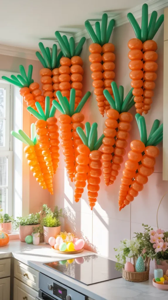 Orange balloons shaped like carrots with green balloon tops make a fun Easter wall feature. Arrange them in rows or diagonally for visual interest. This playful idea works great in kitchens or kids’ spaces.
