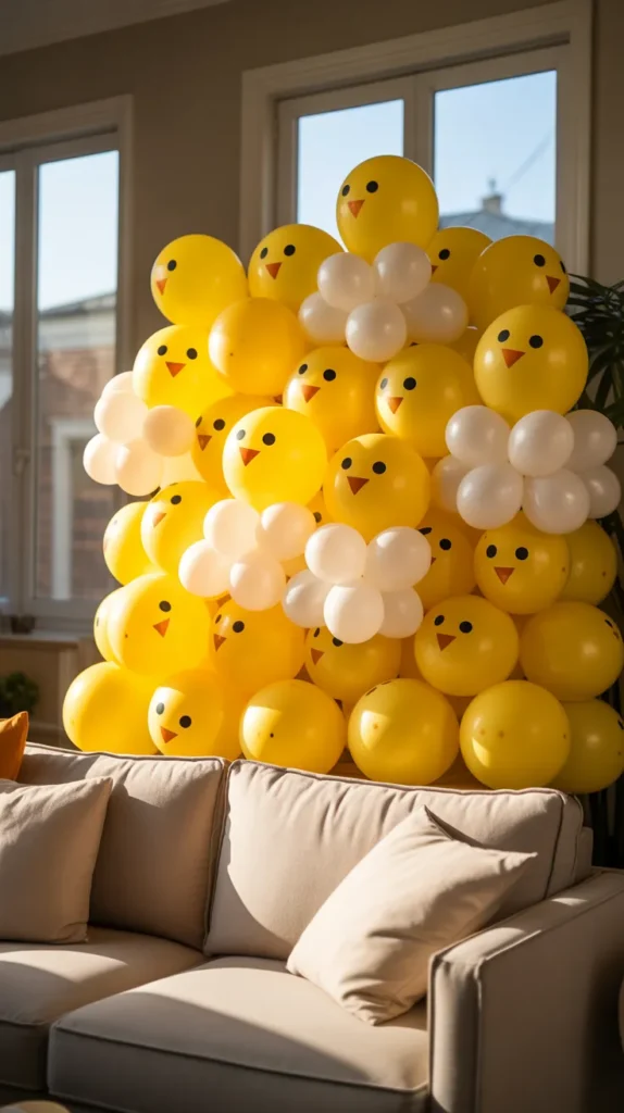 Bright yellow balloons with tiny black eyes create a chick-inspired wall. Add white cloud balloons for contrast. This idea brings instant Easter vibes and works well in classrooms or family rooms.
