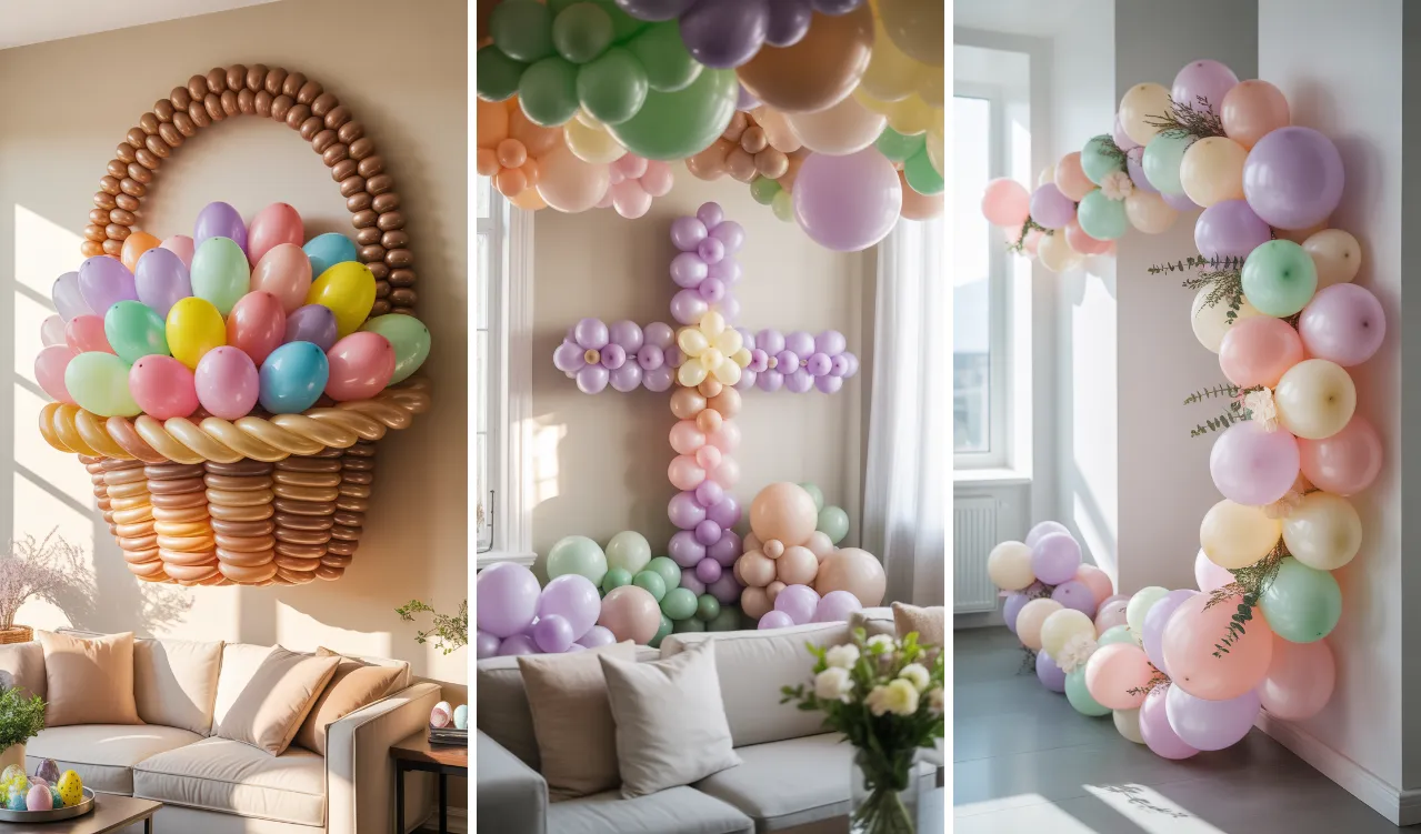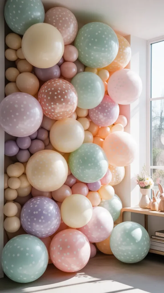An Easter egg balloon cluster wall uses oval balloons in bright colors arranged like oversized eggs. You can spread them across the wall or group them in sections. This design feels fresh and modern while staying simple. It’s perfect for dining rooms or hallway walls.