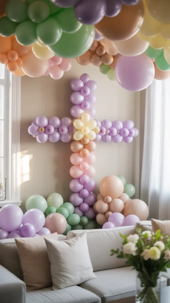 For faith-based celebrations, create a balloon cross surrounded by pastel balloons. This respectful design fits church events or quiet home gatherings.