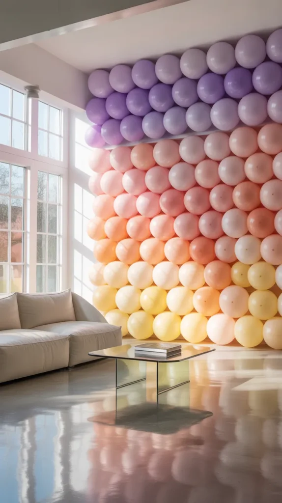 An ombre pastel balloon wall fades from one soft color to another. Start with lavender at the bottom, blend into pink, then yellow at the top. This gradient look feels trendy and Instagram-ready.