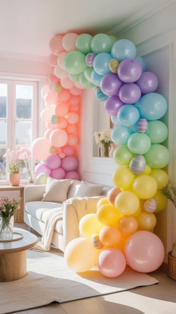 A pastel rainbow balloon wall arch is a classic choice for colorful Easter balloon arrangements for walls. Soft shades like baby pink, mint green, lavender, sky blue, and butter yellow create a calm spring mood. You can place this arch behind a sofa, dessert table, or entry wall. Using mixed balloon sizes adds texture and makes the design look professional without hiring a decorator.