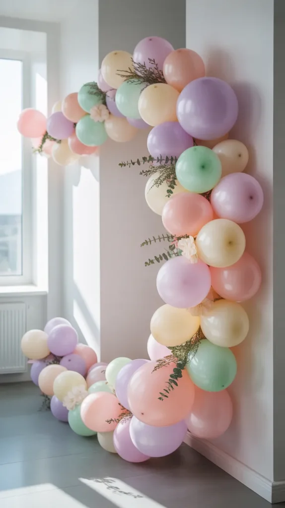 This idea mixes pastel balloons with faux greenery and silk flowers. Start with a soft balloon base, then tuck in leaves and small blooms. The result looks elegant but still playful. It’s ideal for living rooms or brunch backdrops.