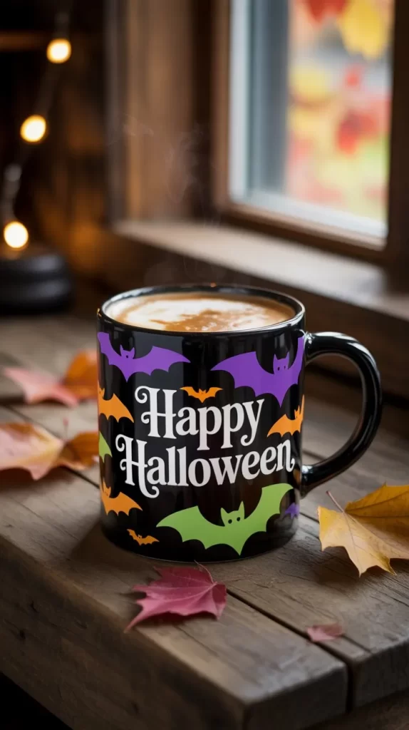 Design a mug in the shape of a witch’s hat or add a hat motif to a regular mug. Use bright colors like purple, green, and orange with glittery accents. Perfect for a magical Halloween feel and adds charm to any indoor or outdoor drink table.