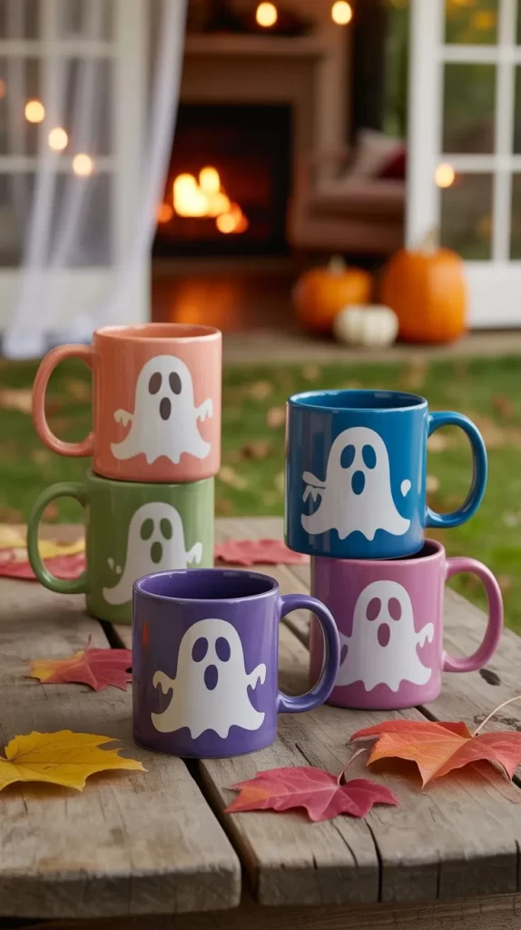 Create a set of mugs featuring a family of colorful ghosts in pink, blue, purple, and green. This coordinated set is playful and cheerful, perfect for parties or indoor gatherings with kids.