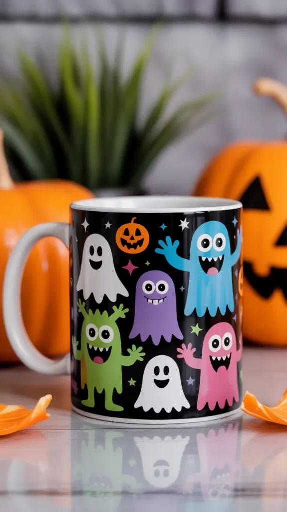 Create a white ghost-shaped mug with cute eyes and a smiling mouth. Add bright accents like pink or green for a fun twist. This whimsical mug is perfect for kids’ drinks or cheerful Halloween gatherings. It’s a friendly, playful design that works for indoor and outdoor events.