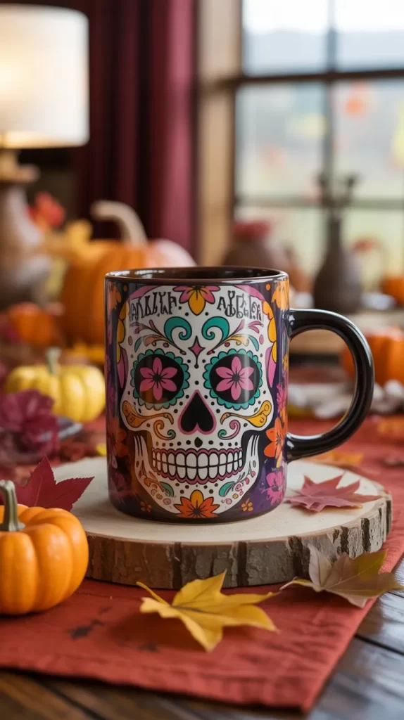 Design a mug featuring a cheerful sugar skull with bright colors like turquoise, pink, orange, and yellow. This festive design is inspired by Dia de los Muertos and works well for a colorful, playful Halloween theme for adults and kids.