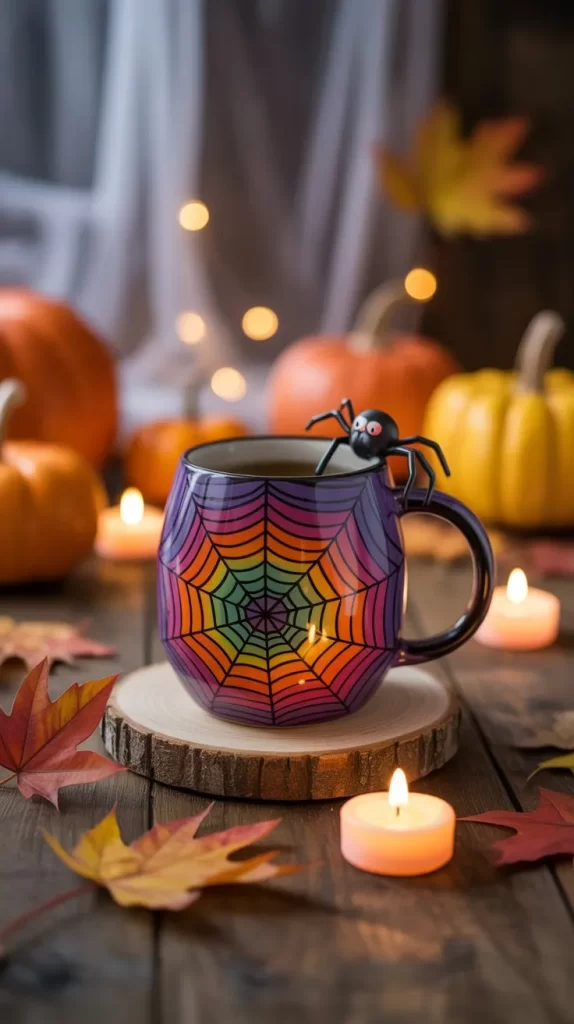 Use a dark-colored mug as the base and draw a colorful spider web in bright shades like orange, purple, and green. Add a small playful spider for extra charm. This whimsical design adds fun and festivity to your Halloween drinkware.