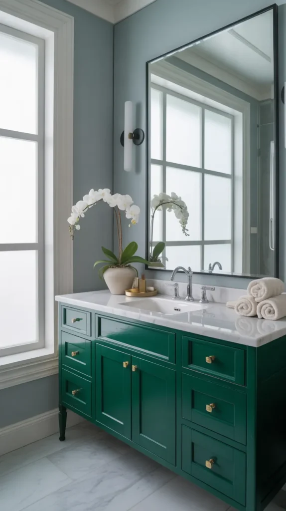 A bold-colored vanity is one of the easiest ways to refresh a modern bathroom. Colors like teal, emerald green, navy blue, or mustard yellow instantly add personality. When paired with neutral walls, the vanity becomes the main focus without overwhelming the space. This works especially well in small bathrooms where wall space is limited.