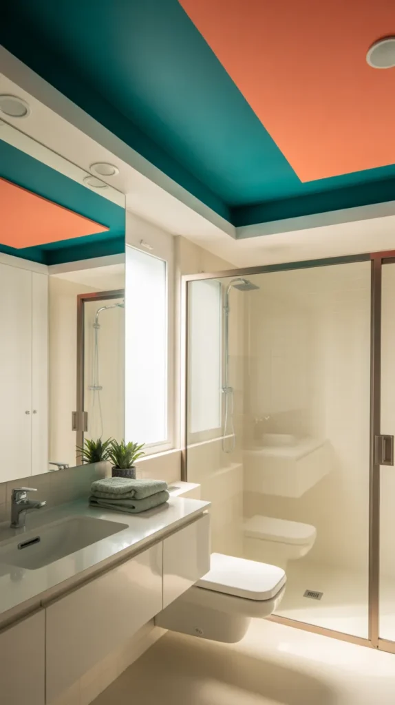 Painting the ceiling a soft or bold color adds surprise to a modern bathroom. It draws the eye upward and makes the space feel unique.