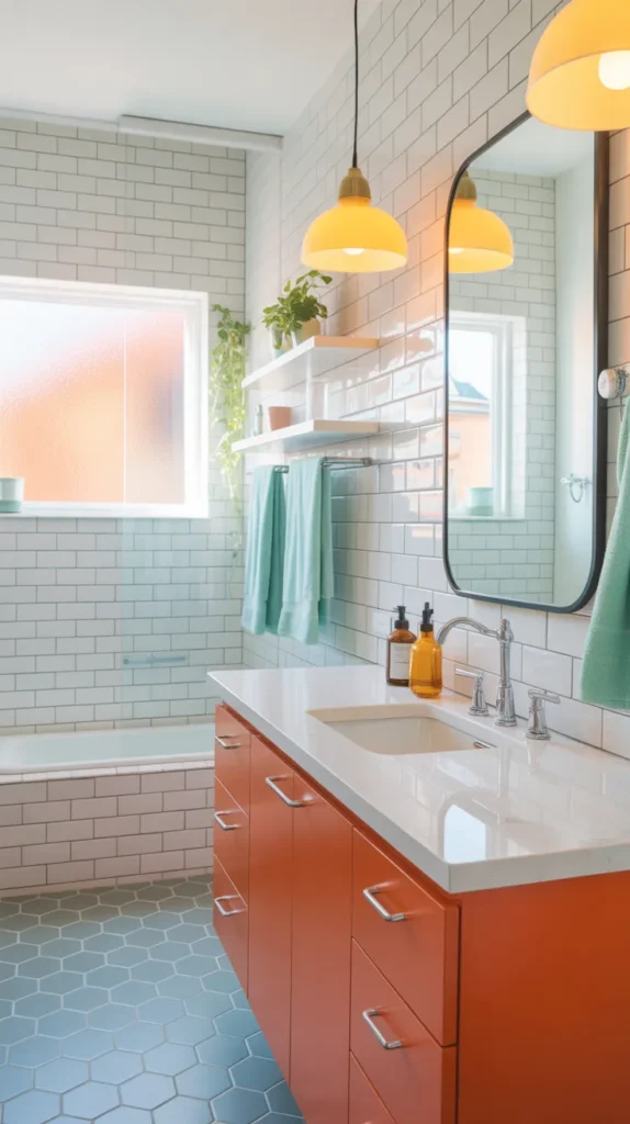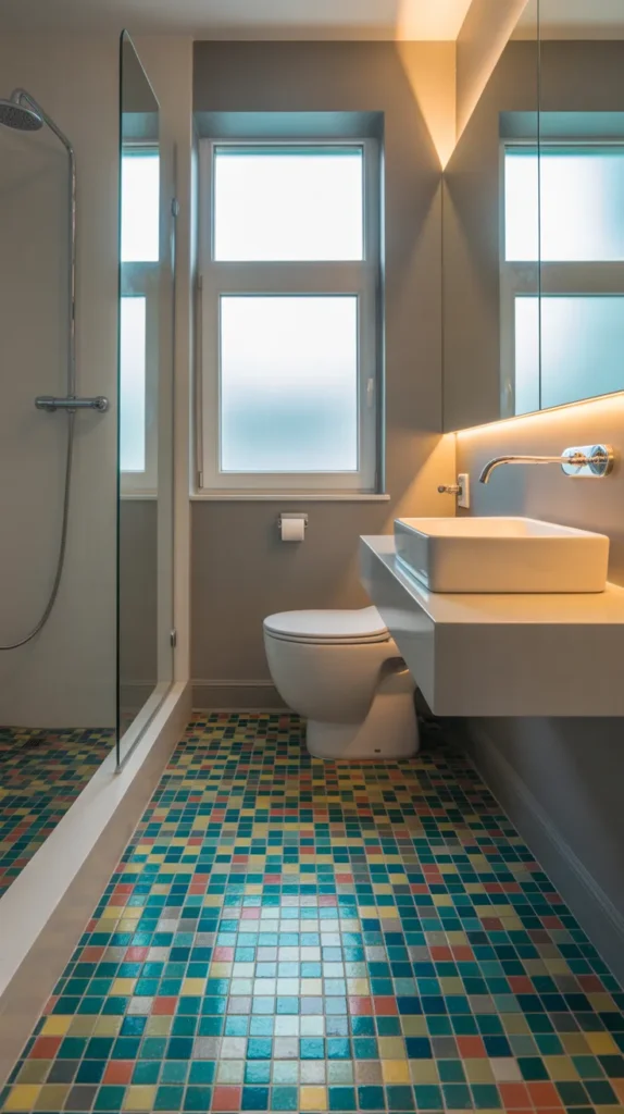 Colorful floor tiles add personality while keeping walls clean and modern. Patterned or solid-color tiles bring life to the space and draw attention downward, making the bathroom feel grounded.