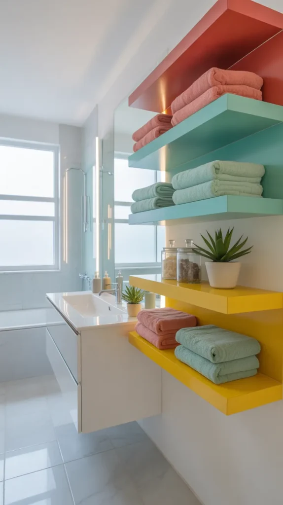 Colorful storage units add both function and style. Open shelves or cabinets in bold colors make bathrooms look organized and lively.