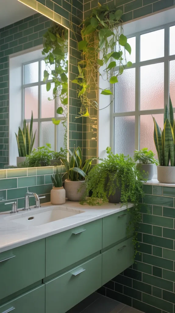 Green accents bring a fresh and calming feel to modern bathrooms. Shades like olive, sage, or forest green work beautifully with white and wood tones. Plants add extra freshness and life.
