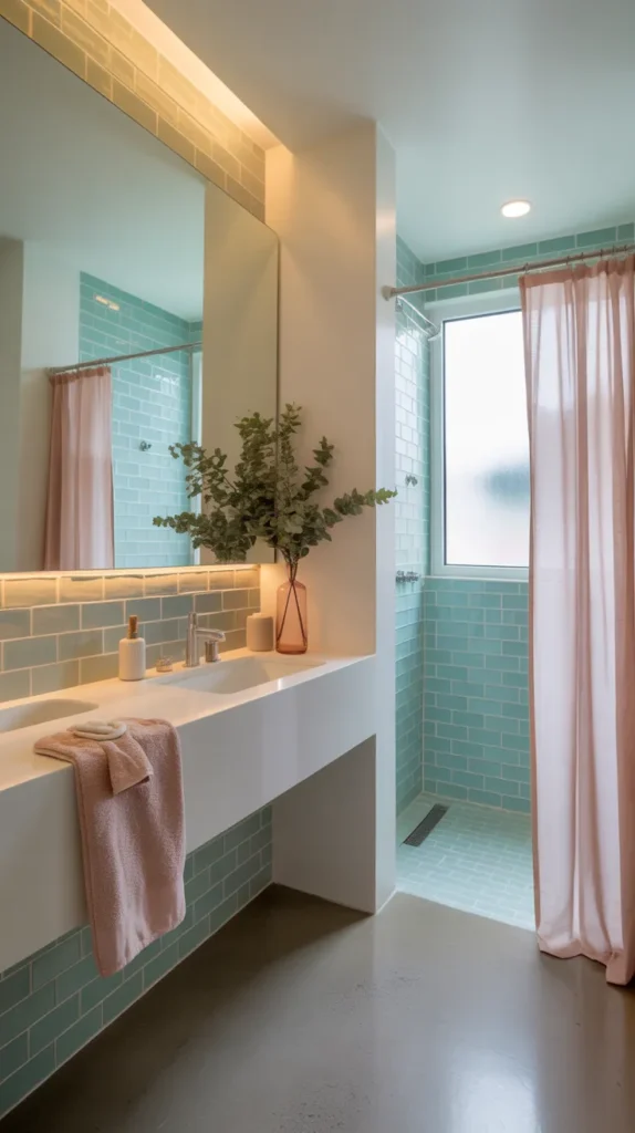 Pastel accents bring color without being too bold. Shades like mint green, blush pink, or soft lavender create a peaceful and modern bathroom atmosphere. These colors work well in small spaces because they reflect light and make the room feel open.