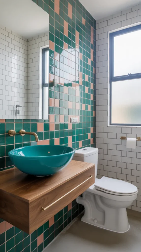 A colorful tile accent wall adds texture and interest to a modern bathroom. Tiles in shades like turquoise, coral, or deep blue work beautifully behind the sink or inside the shower area. This creates a strong visual feature while keeping the rest of the bathroom simple.