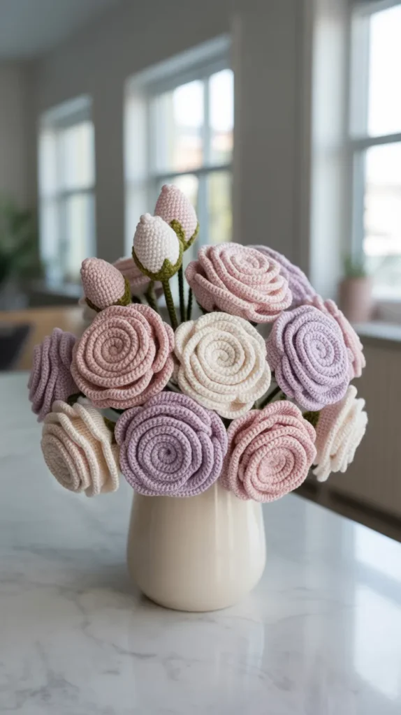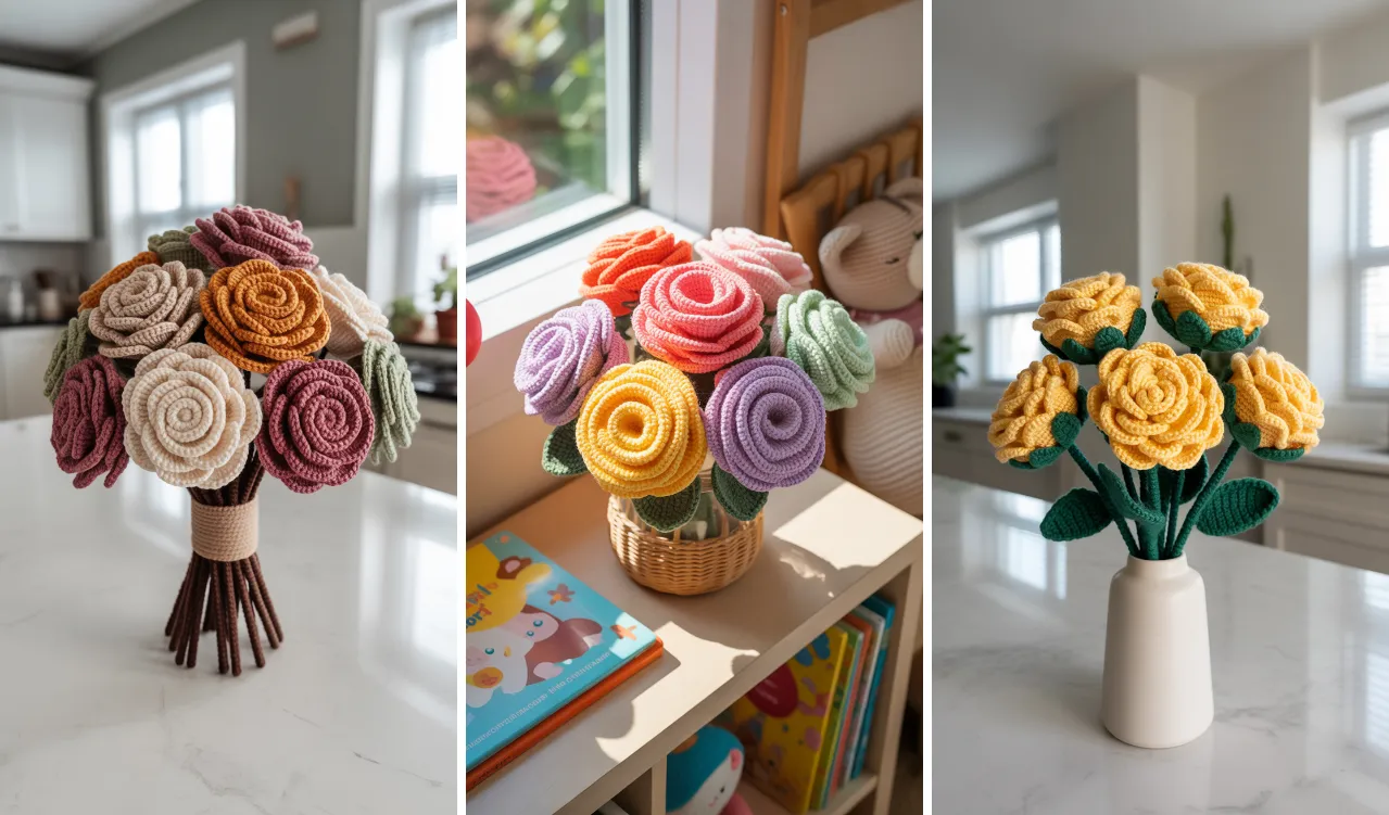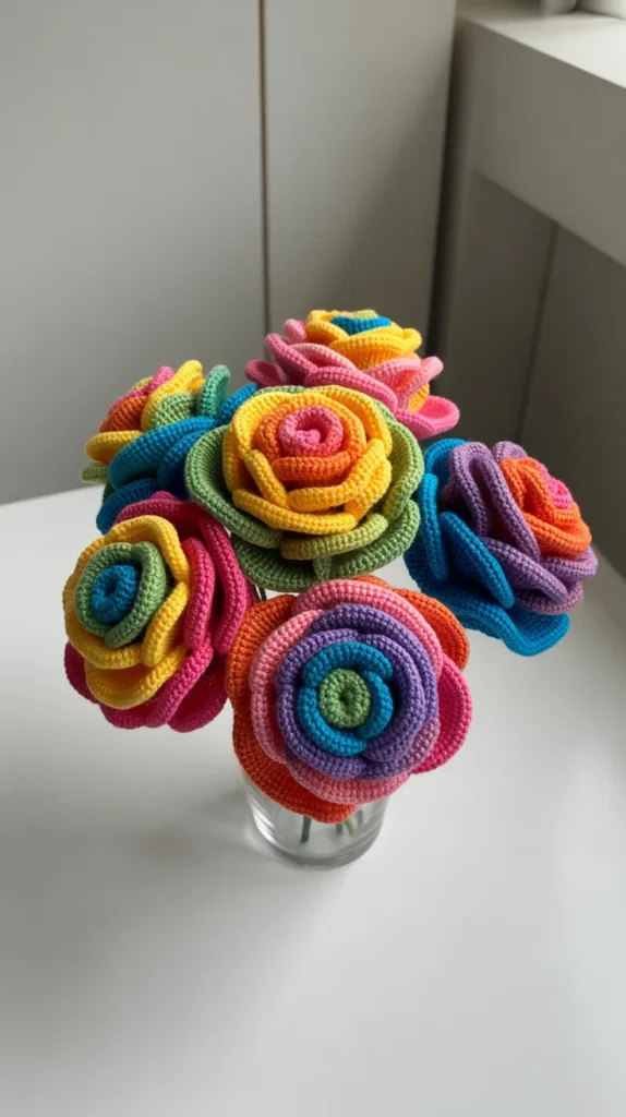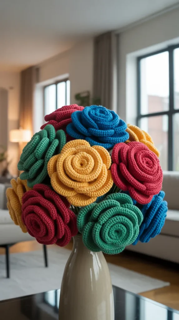 Below are 15 creative and colorful rose crochet bouquet ideas that bring timeless beauty to home décor.