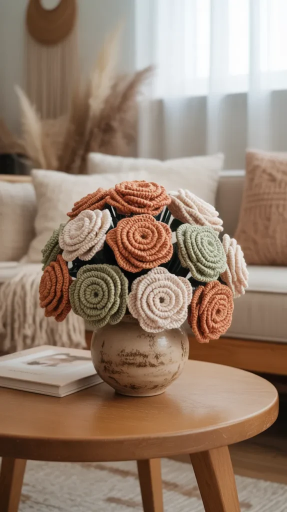A boho rose crochet bouquet uses earthy colors like rust, mustard, dusty pink, and olive green. These tones create a relaxed and artistic look that fits boho-style homes perfectly. The handmade crochet texture adds warmth and character.
