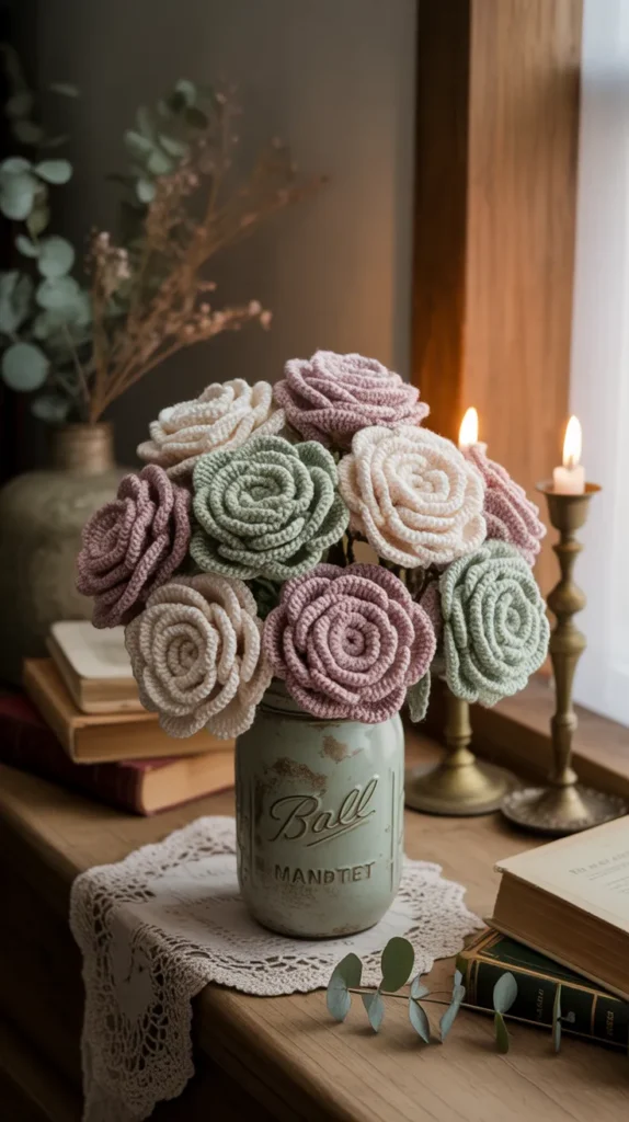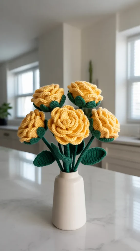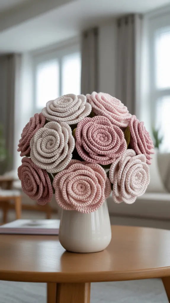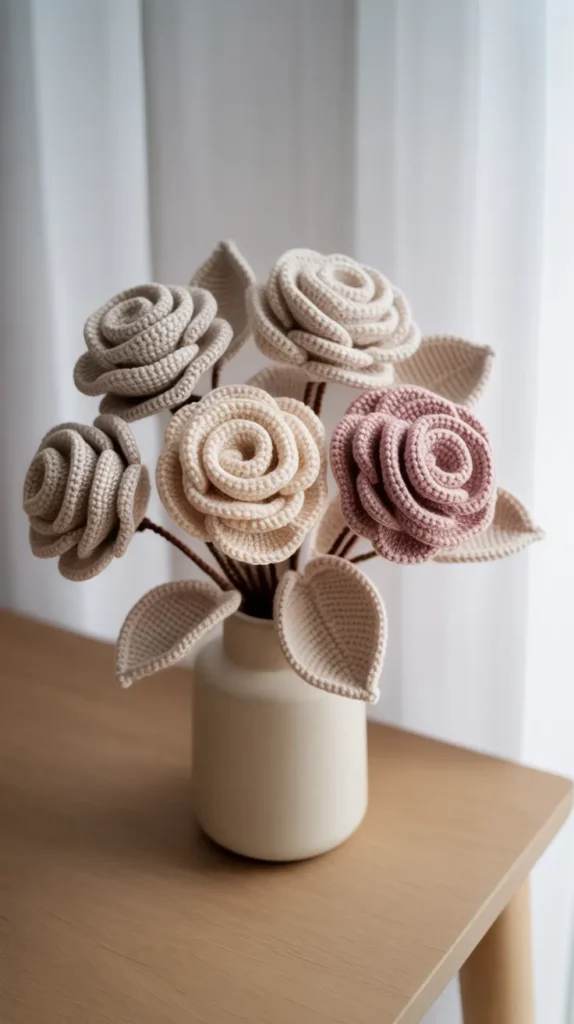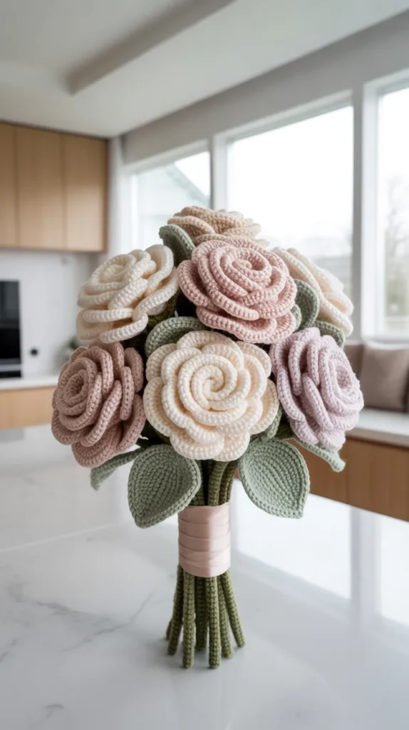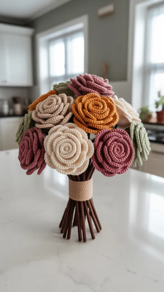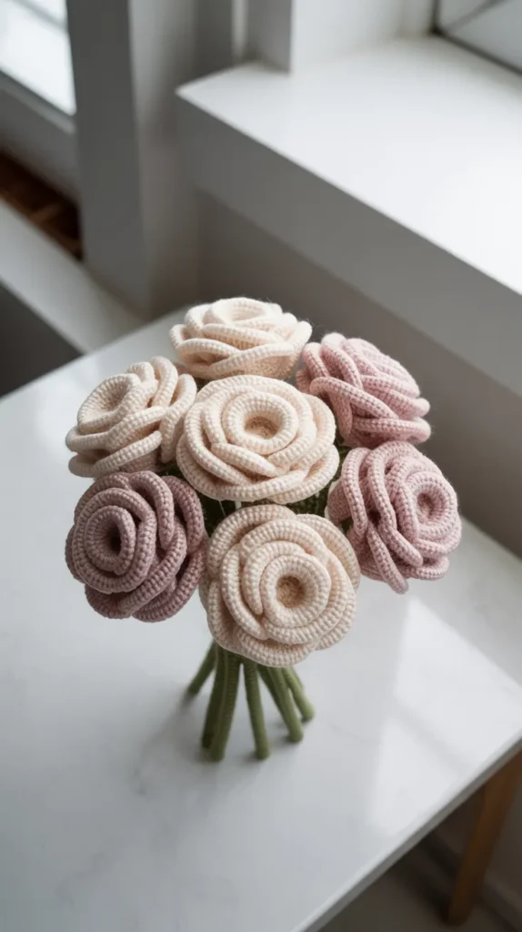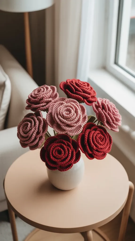 A small crochet rose bouquet is perfect for tables and shelves. It adds color without taking up much space.