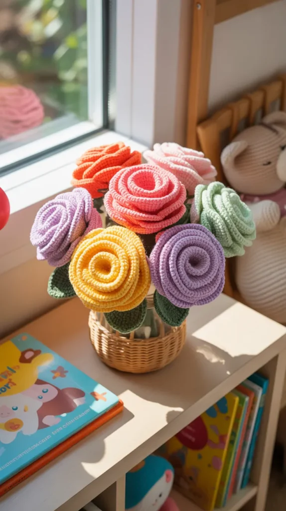 Bright and playful crochet rose bouquets are perfect for kids’ rooms. Soft yarn makes them safe and friendly.