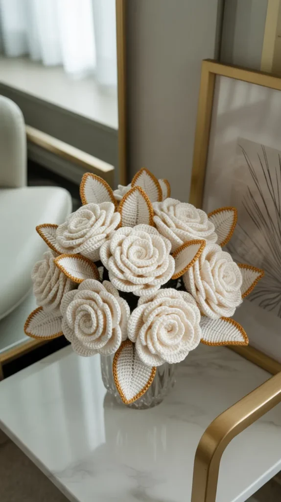 A white and gold rose crochet bouquet feels elegant and timeless. White roses bring calm and purity, while gold thread accents add a touch of luxury. This combination works beautifully in modern and traditional homes alike.