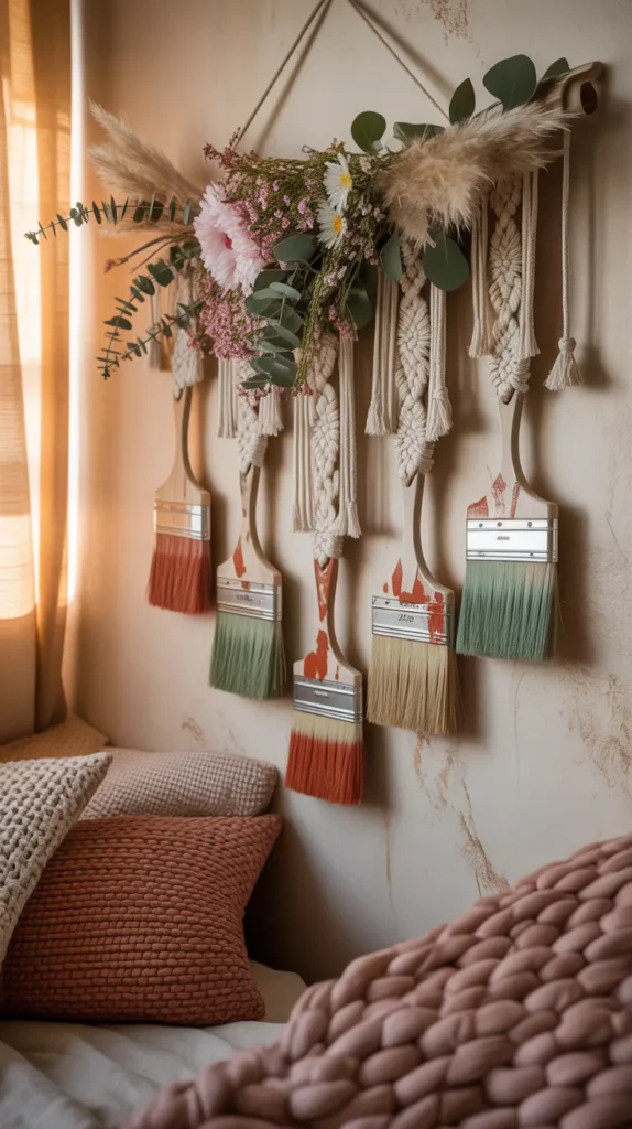 Use macrame cord to hang decorated paint brushes vertically with dried flowers and spring blooms. This boho wall piece adds texture and color to bedrooms, reading corners, or creative studios. It is a trendy and affordable alternative to expensive wall art.