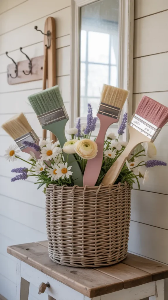 Create an entry table display using oversized paint brushes decorated with garden flowers such as daisies, ranunculus, and lavender. Lean them inside a basket or ceramic pot near the front door. This makes guests feel welcome and adds a fresh seasonal mood right away. It is a stylish and budget-conscious way to decorate the entrance.