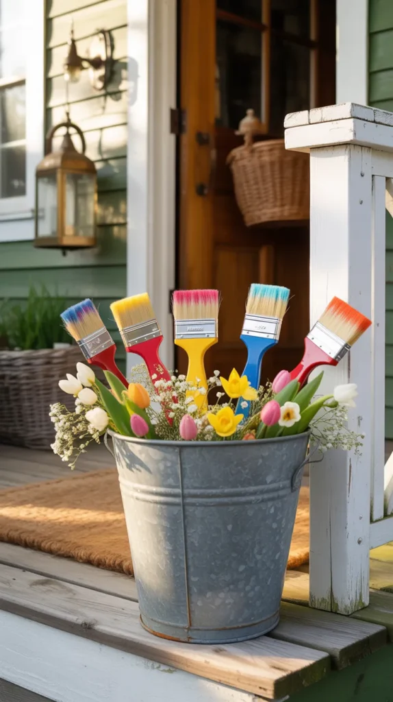 Fill a galvanized bucket with painted brushes and bright flowers for front porch decor. This setup is eye-catching, weather-friendly when placed under cover, and perfect for farmhouse homes. It creates strong curb appeal without major expense.