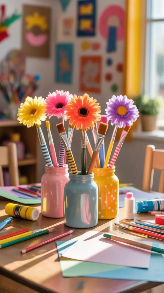 Turn paint brushes into fun decor for a kids craft room by using bright colors and playful flowers. Paint handles with stripes, dots, or stars, then attach colorful blooms. This cheerful display encourages creativity and makes the room feel lively and inspiring.