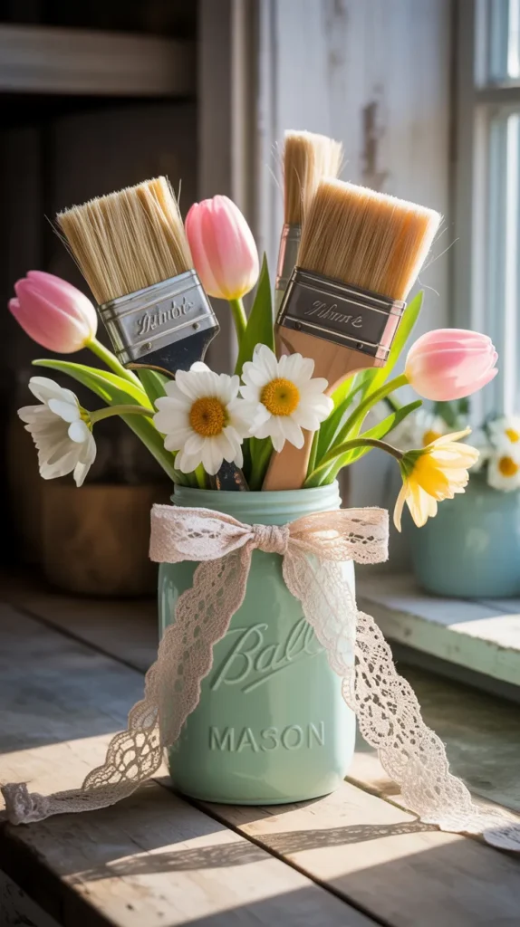 Place decorated paint brushes with spring flowers inside a mason jar for a simple but beautiful centerpiece. Paint the jar in pastel tones or wrap it with ribbon and lace. This arrangement works well for kitchen tables, window sills, or party decor. It is affordable, easy to make, and perfect for seasonal styling.
