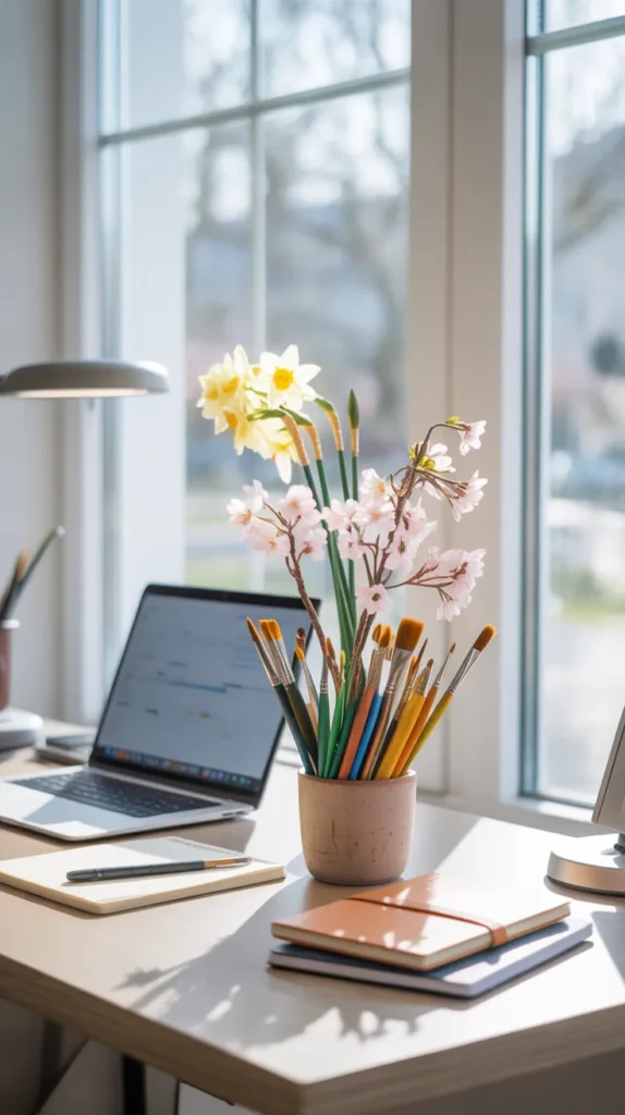 Add a small bouquet of decorated paint brushes to your office desk for a cheerful workspace update. Fresh colors can make the desk feel more welcoming and creative. This is perfect for home offices, studios, or reception desks.