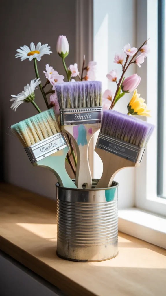 Reuse old cleaned paint brushes instead of throwing them away. Sand them lightly, repaint them, and add faux flowers for a sustainable spring project. This helps reduce waste while creating something beautiful and useful.