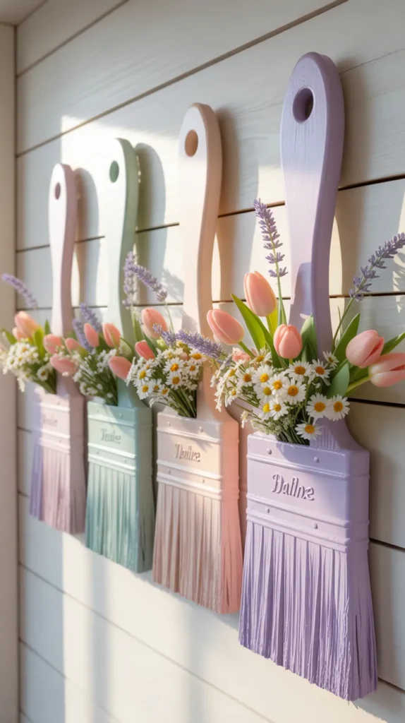 Turn wide wooden paint brushes into charming wall decor by painting the handles in pastel shades and attaching faux tulips, daisies, and lavender at the top. The wood texture gives a farmhouse feel, while the bright flowers add a fresh spring touch. This idea looks beautiful in entryways, kitchens, or porch walls. It is a smart purchase because one simple display can update a whole room without expensive renovations.