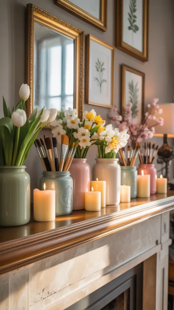 Decorate your mantel with a row of painted brushes in different spring colors, each topped with flowers. This creates height, texture, and a bold focal point in the room. It is perfect for fireplaces, console tops, or shelf mantels.