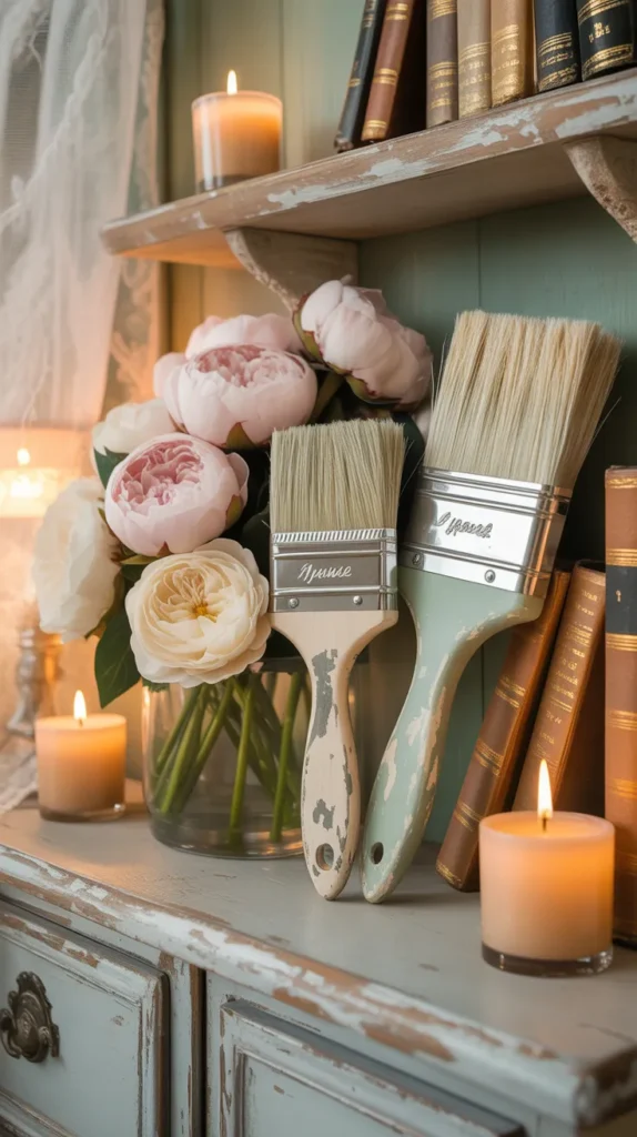 Give old paint brushes a vintage makeover with distressed paint, soft floral patterns, and muted spring bouquets. Display them on floating shelves beside books, candles, or frames. This style feels elegant and timeless, making it perfect for cottagecore or shabby chic interiors. It is a cost-effective way to create designer-style shelf decor using simple materials.