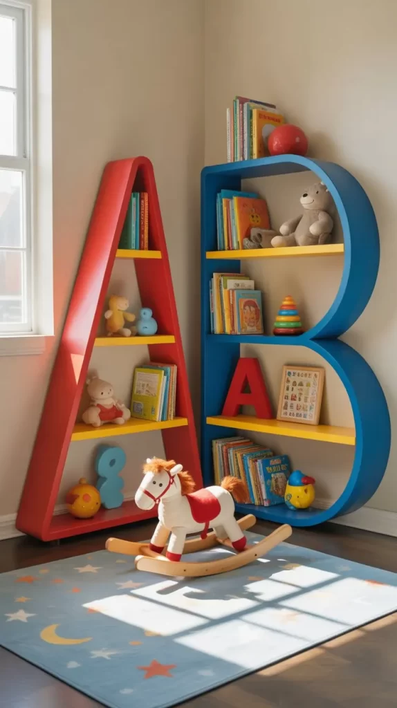 Letter-shaped corner shelves are both decorative and educational. Spell your child’s name or fun words, and use the shelves to store books, toys, or crafts. This design encourages learning while adding a colorful, customized look. Bright primary colors make the corner visually exciting.