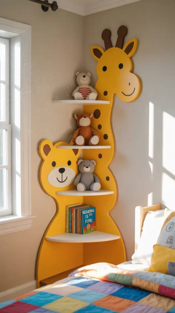 Transform your corner into a mini zoo with animal-shaped shelves. Shelves shaped like elephants, giraffes, or bears make storage fun and decorative. Place small toys, figurines, or books on them. These shelves stimulate imagination and create an engaging visual experience. They are also educational if you pair each shelf with the animal’s name.
