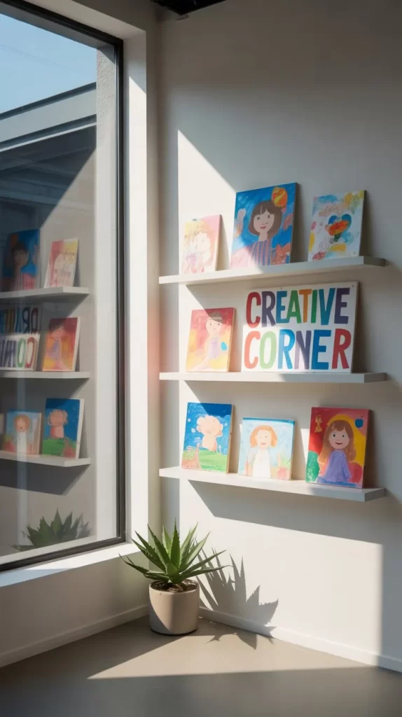 Use floating corner shelves to display kids’ artwork or crafts. Paint the shelves in bright colors and place their creations in frames or stands. This turns the corner into a mini art gallery, boosting confidence and creativity.