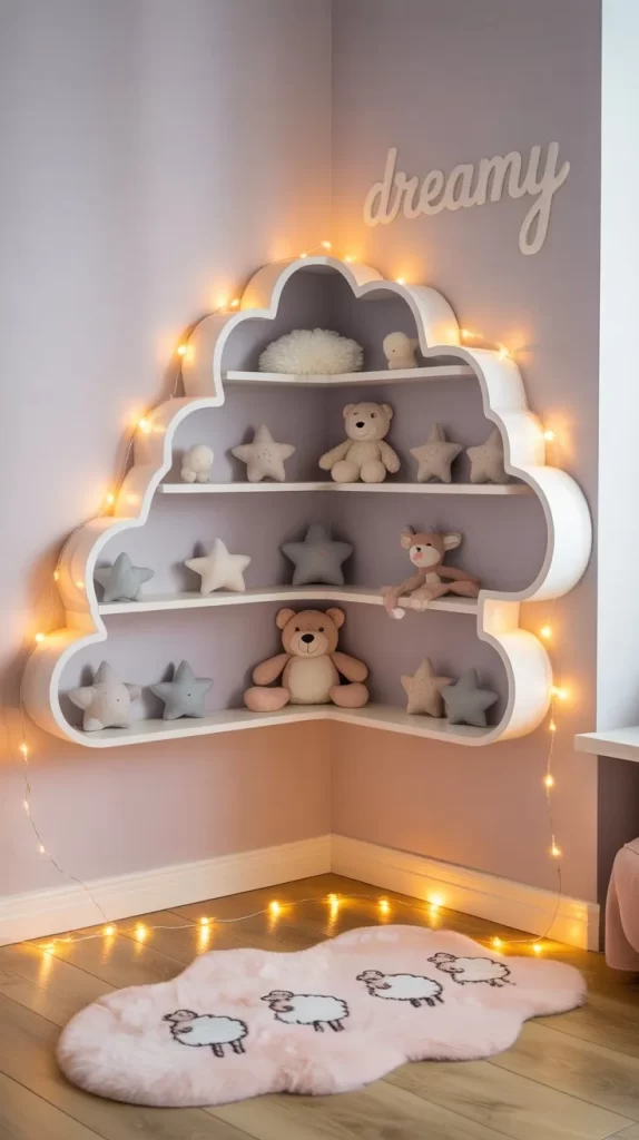 Cloud-shaped corner shelves bring a dreamy vibe to your kid’s room. Perfect for storing books, night lights, or small toys. Use pastel colors or soft white with hints of blue for a calming yet playful effect. These shelves create an imaginative space where kids feel like they’re floating among the clouds.
