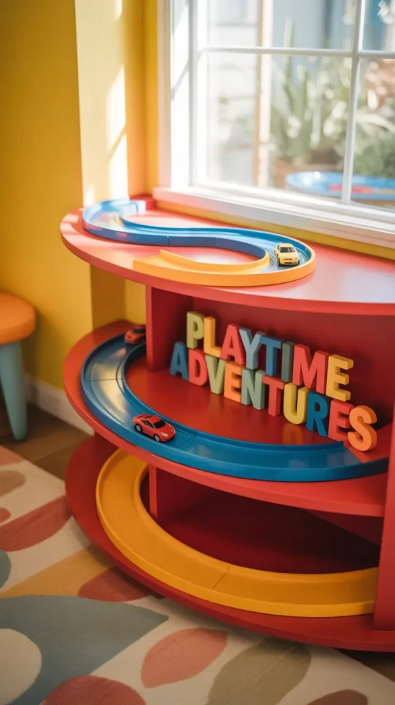 Perfect for car-loving kids, these corner shelves double as a display and a toy track. Arrange shelves at angles so toy cars can roll down from top to bottom. Paint the shelves in bright racing colors for extra fun. This interactive corner encourages play while keeping toys organized.