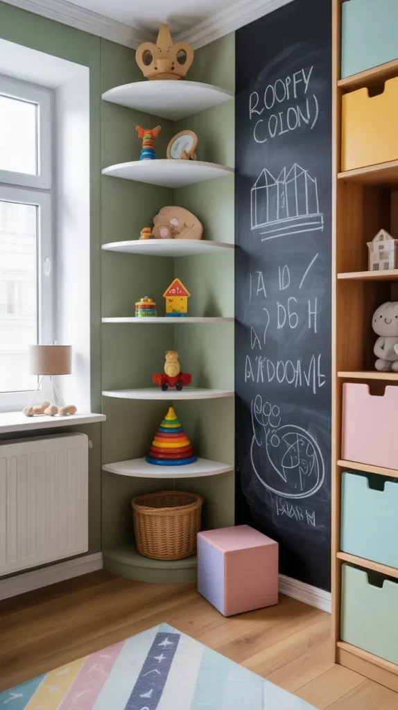 Add a chalkboard background behind corner shelves for drawing, writing, or doodling. Place toys, books, or decorative items on the shelves. Kids can change the background daily, making it a fun, interactive, and creative corner.