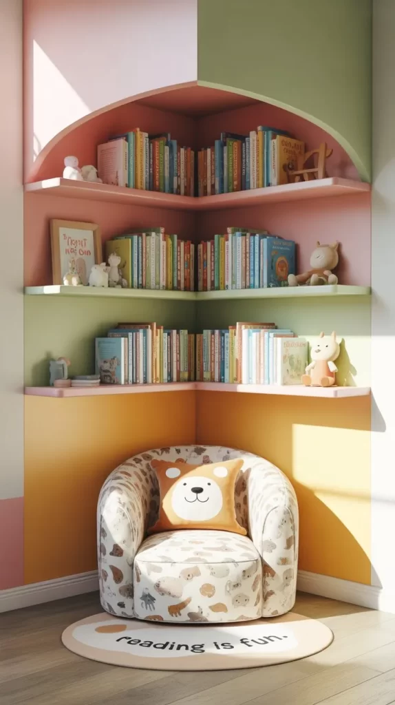 Create a reading nook with corner shelves stacked with colorful books. Add a small cushioned chair or bean bag for comfort. Arrange books by color or size to make the corner visually pleasing. This encourages reading while keeping the space neat and playful.