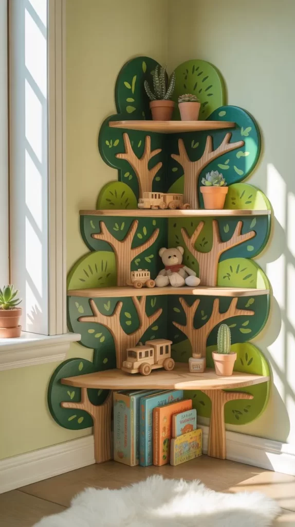 Wooden corner shelves shaped like trees, leaves, or branches create a natural, cozy vibe. Add small plant pots, animal figurines, or handmade crafts for an earthy, cheerful atmosphere. The natural tones pair well with colorful toys, creating balance and warmth in the room.