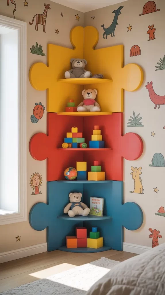Shelves shaped like puzzle pieces can interlock or sit separately in a corner. Paint each piece in bright colors and use them to store toys, books, or crafts. This playful design encourages problem-solving and adds a vibrant, interactive element to the room.