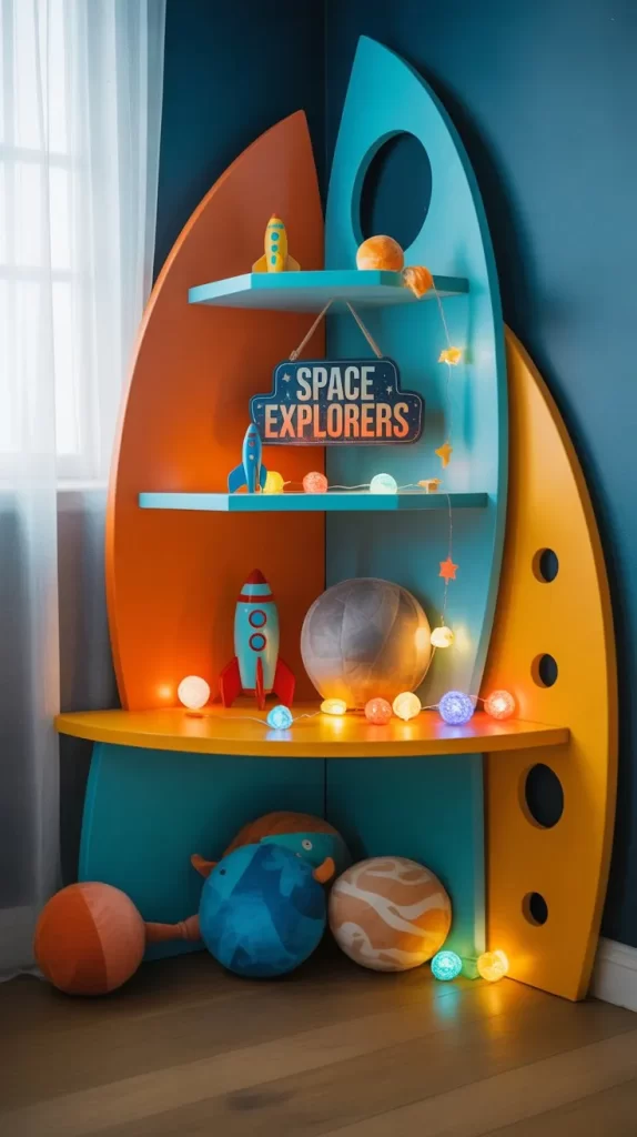 Create a cosmic corner with shelves shaped like rockets, planets, or stars. Paint the wall in dark blue or purple, then add shelves in bright, contrasting colors. Display space toys, books, and planets to create a fun and educational corner that encourages curiosity about the universe.